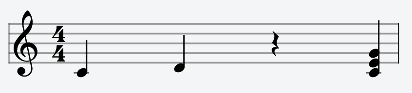 const notesMeasure1 = [new StaveNote({ keys: ["c/4"], duration: "q" }), new StaveNote({ keys: ["d/4"], duration: "q" }), new StaveNote({ keys: ["b/4"], duration: "qr" }), new StaveNote({ keys: ["c/4", "e/4", "g/4"], duration: "q" })];
