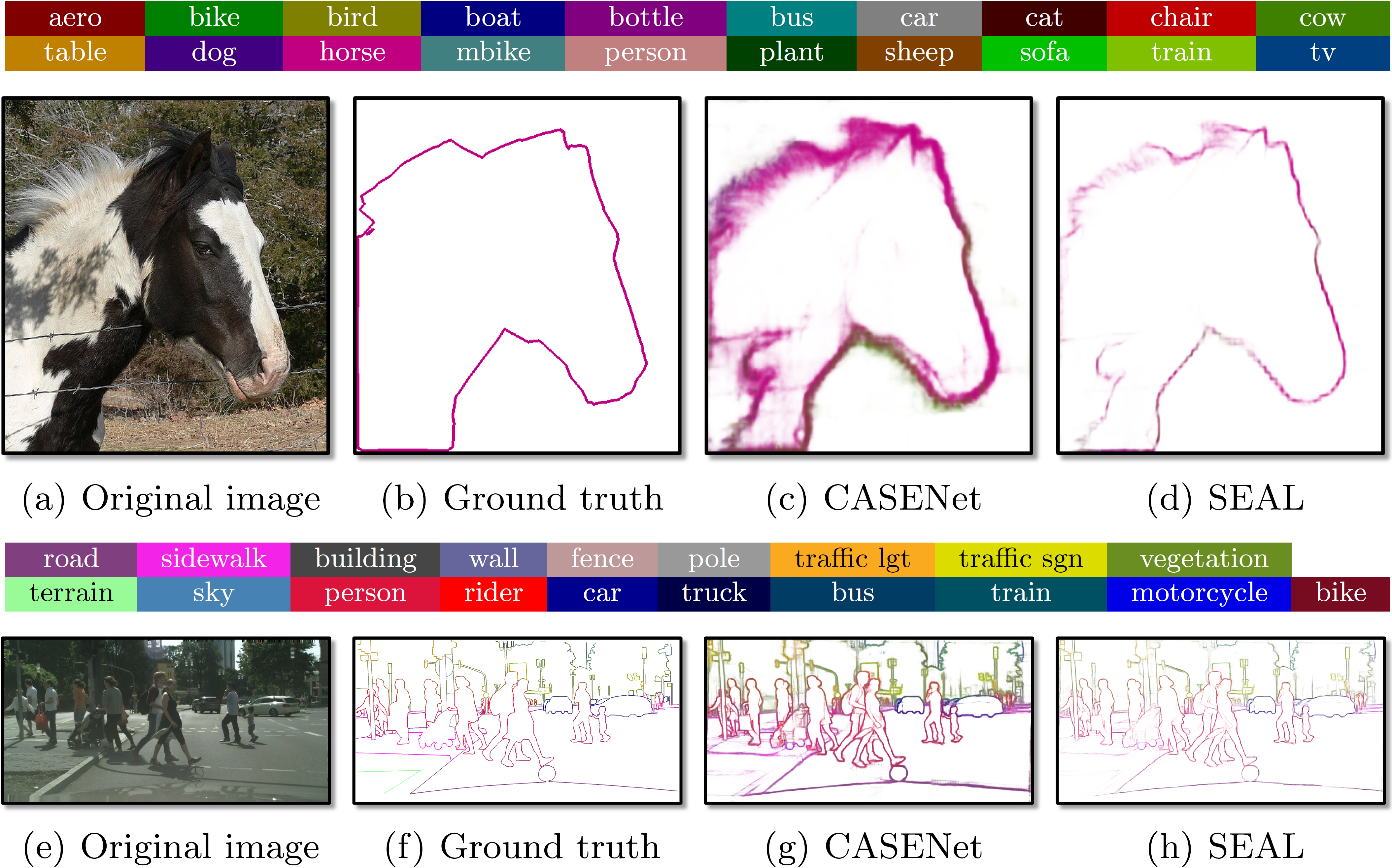 SEAL is a recently proposed learning framework towards edge learning under noisy labels. The framework seeks to directly generate high quality thin/crisp object semantic boundaries without any post-processing, by jointly performing edge alignment with edge learning. In particular, edge alignment is formulated as latent variable optimization and learned end-to-end during network training. For more details, please refer to the arXiv technical report and the ECCV18 paper. We highly recommend the readers refer to arXiv for latest updates in detailed description and experiments.