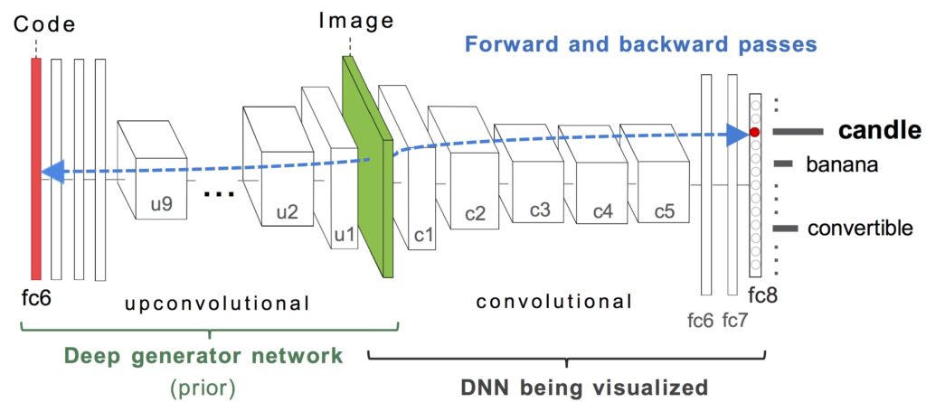The main algorithm is in act_max.py, which is a standalone Python script; you can pass various command-line arguments to run different experiments. Basically, to synthesize a preferred input for a target neuron h (e.g. the “candle” class output neuron), we optimize the hidden code input (red) of a deep image generator network to produce an image that highly activates h.