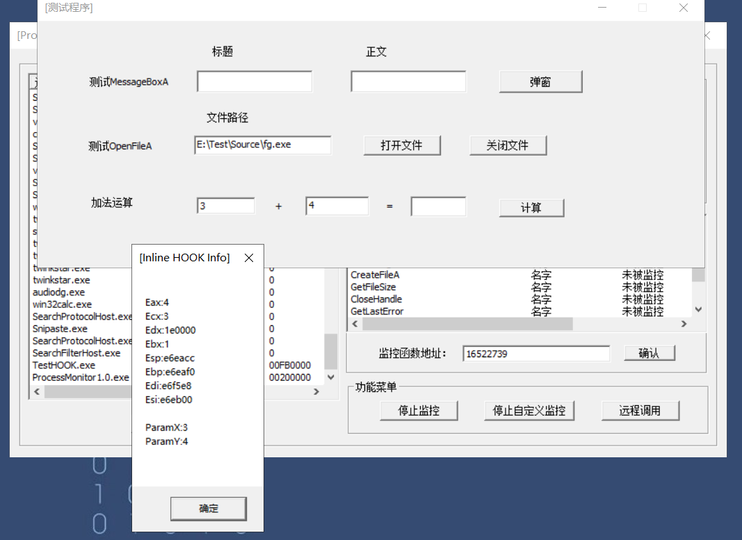 32位进程函数监控 开发环境: Win10 VisualStudio 2019 多字节集编码 x86 介绍: 选择进程后,隐藏模块注入DLL,控制端利用命名管道与注入的DLL进行通信,使用IAT HOOK监控导入表中存在的API的调用情况。对于导入表中不存在的函数,可以手动输入函数地址进行Inline HOOK,实现自定义监控。还可以对被注入进程中的函数进行远程调用。 用到知识: 1.隐藏模块注入(修复IAT表、修复重定位表) 2.进程通信 3.IAT HOOK和Inline HOOK 演示: 隐藏模块注入: IAT HOOK实现监控: Inline HOOK实现自定义监控: 远程调用: