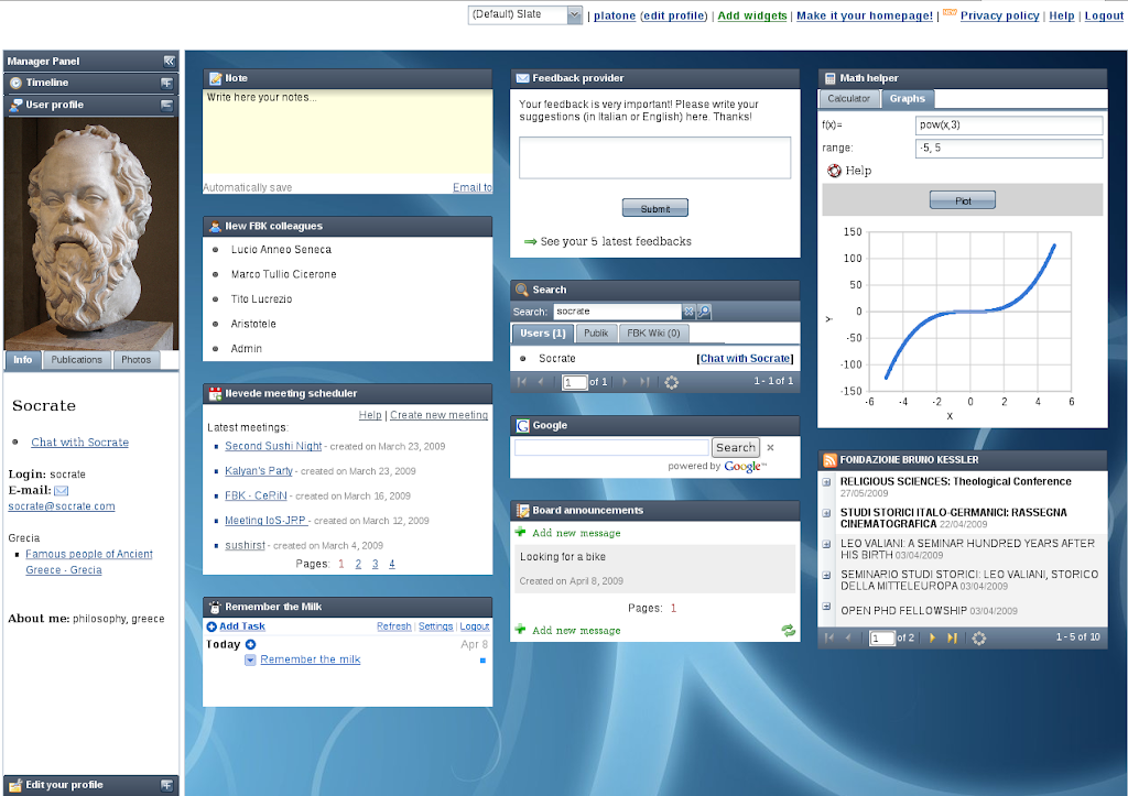 The web desktop consists of a personal dashboard customisable by adding micro-applications called widgets. Each widget offers a different service that can be provided as a view over internal services or repositories (e.g. access to papers repository) or as a communication service (e.g. jabber web chat) or as an external resource (e.g. Google search).