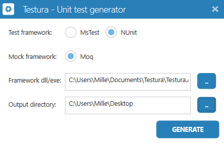 unitTestGenerator.GenerateUnitTests(DllPath, TestFrameworks.NUnit, MockFrameworks.Moq, OutputDirectory);