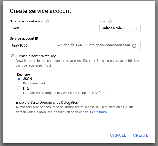 3. In the Create service account window, type a name for the service account, and select Furnish a new private key. Then click Create.