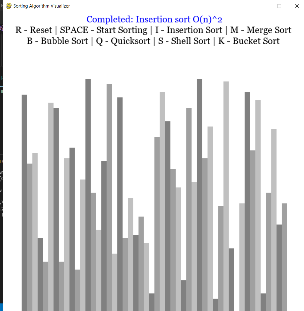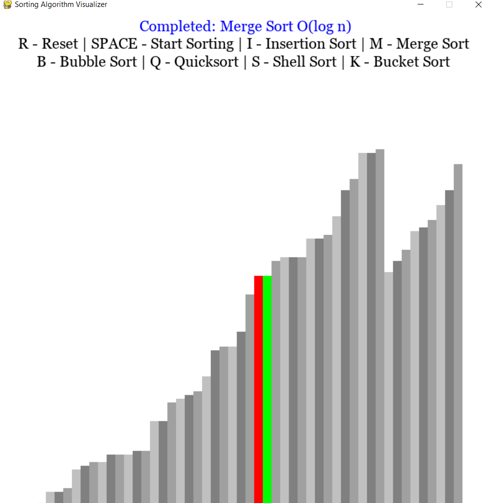 An Interactive tool to visualize common sorting Algorithms seen in first year courses at the University of Waterloo. The tool is simple to use. Just press the key matching the sorting algorithm you want to visualize and enjoy! Once done, press R to randomize the list again so you can explore other sorting algorithms. Algorithms used: