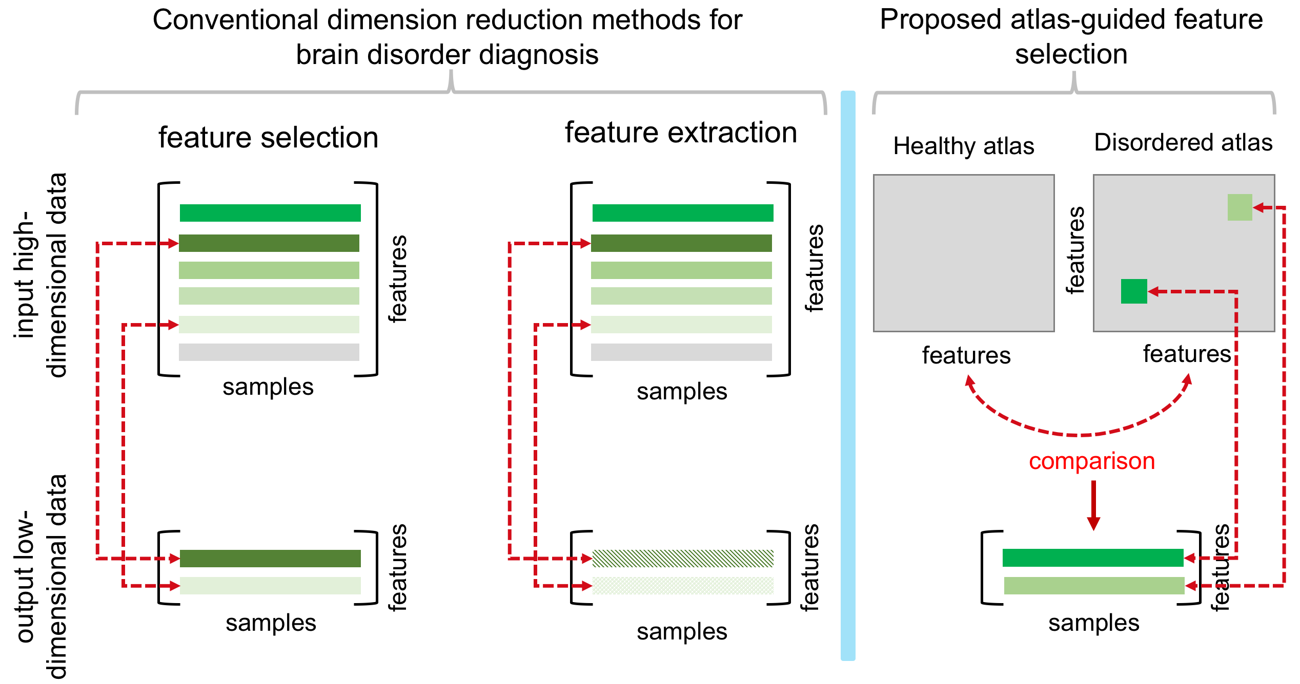 While typical feature selection (FS) methods aim to identify the most discriminative features in the original feature space for the target classification task, feature extraction (FE) methods cannot track the original features as they extract new discriminative features via projection. Hence, FS methods are more convenient for clinical applications for biomarker discovery. However, existing FS methods are generally challenged by space, time, scalability, and reproducibility. To address these issues, we design a simple but effective feature selection method, which identifies the most discriminative features by comparing healthy and disordered brain network atlases to learn.