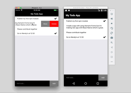 I added Long press Android behavior with using awesome Action Sheet libarary on awesome Swipeout library. Because "Swipe to delete" action is not compatible for Android since it has horizontal scrollable tab navigation.