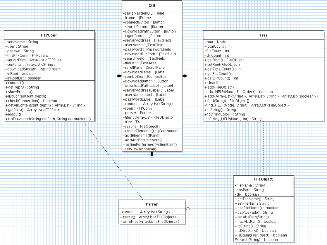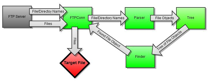 After a connection to a server has been established, the program recursively iterates through all of the directories on the server and generates a Tree, containing FileObject