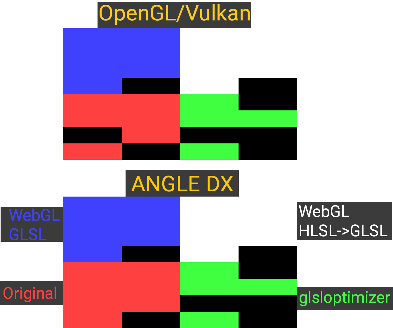 Angle experience - some of bug-related experience (unexpected behavior when your code is fine) - launching my GLSL card game in ANGLE fist time (video), Godot in ANGLE FBO size jump (video), till 2019 (pre 76 version) Chrome had broken instanced particles support.