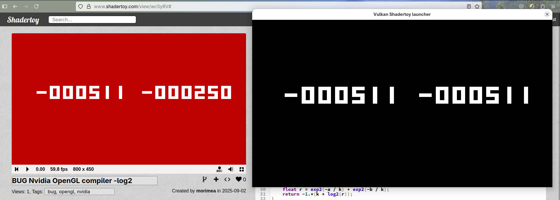 BUG Nvidia OpenGL compiler -log2 - Nvidia OpenGL compiler bug return (-k * log2(r)); bugged and not equal to return -1.*(k * log2(r)); Nvidia |