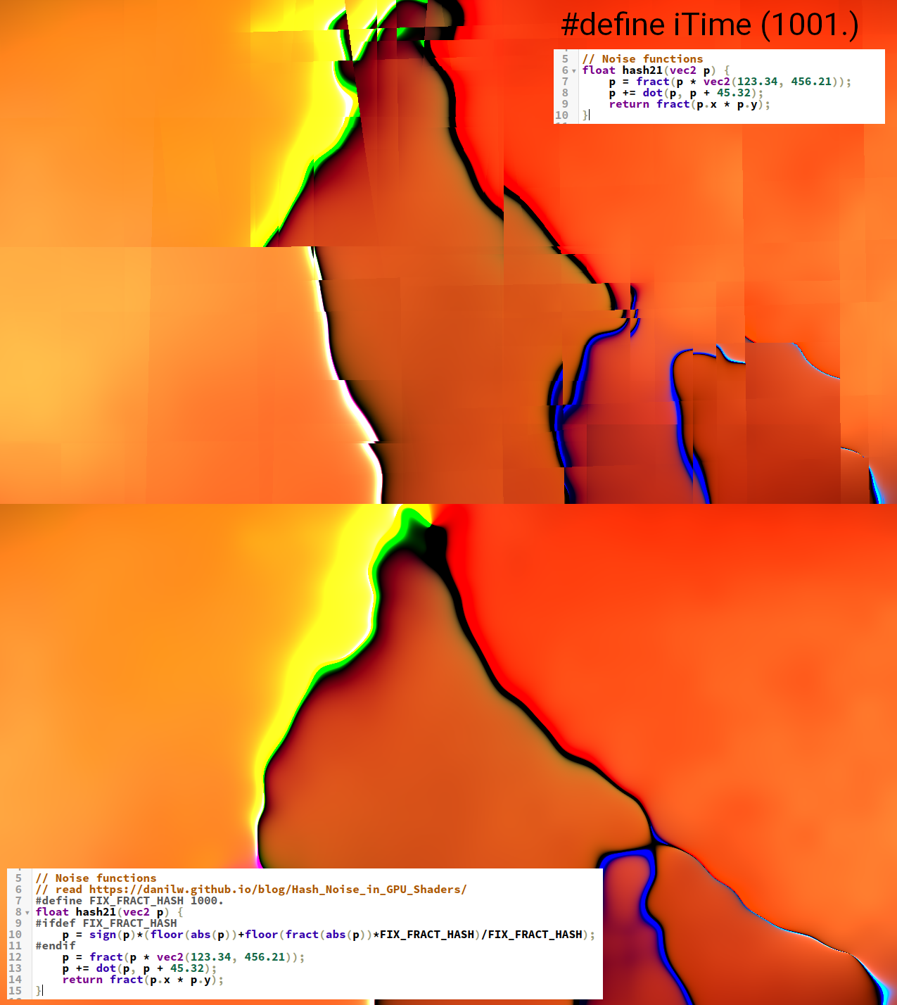 Related-example of fract-hash instability described in blog post Hash Noise stability in GPU Shaders, blog mirror. Shader link. | |