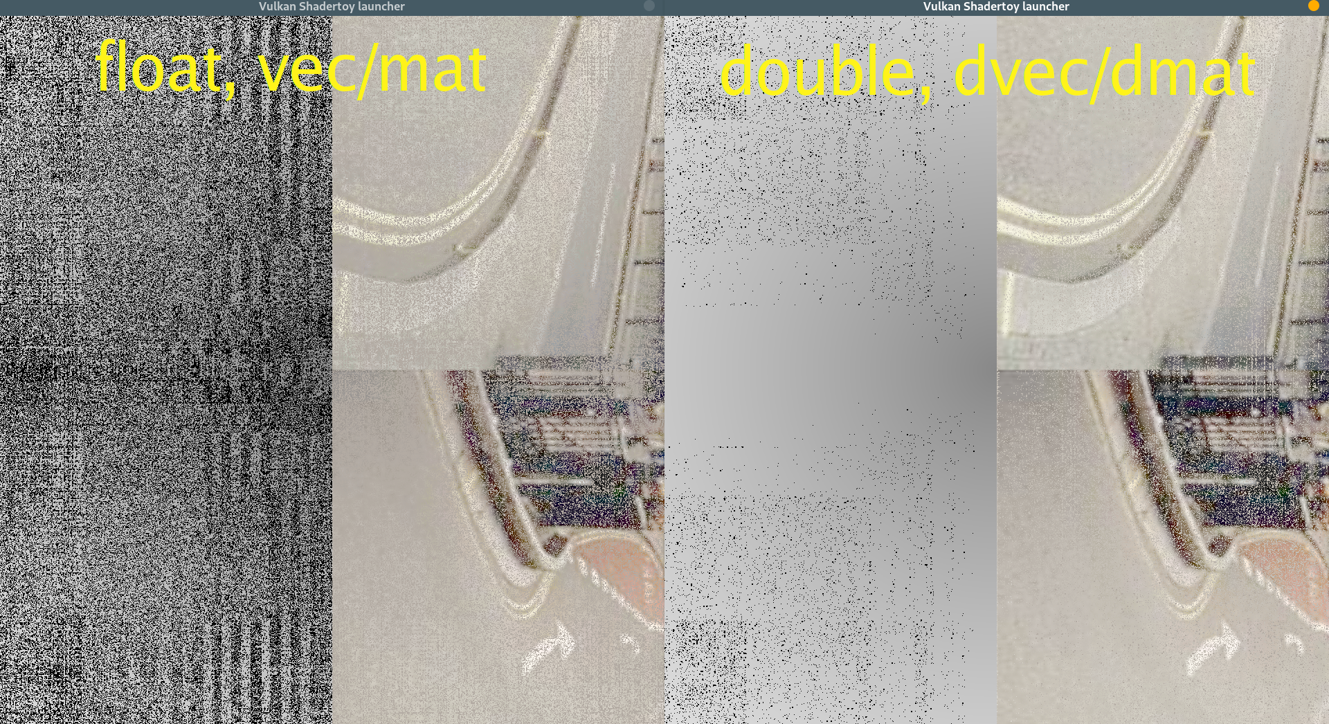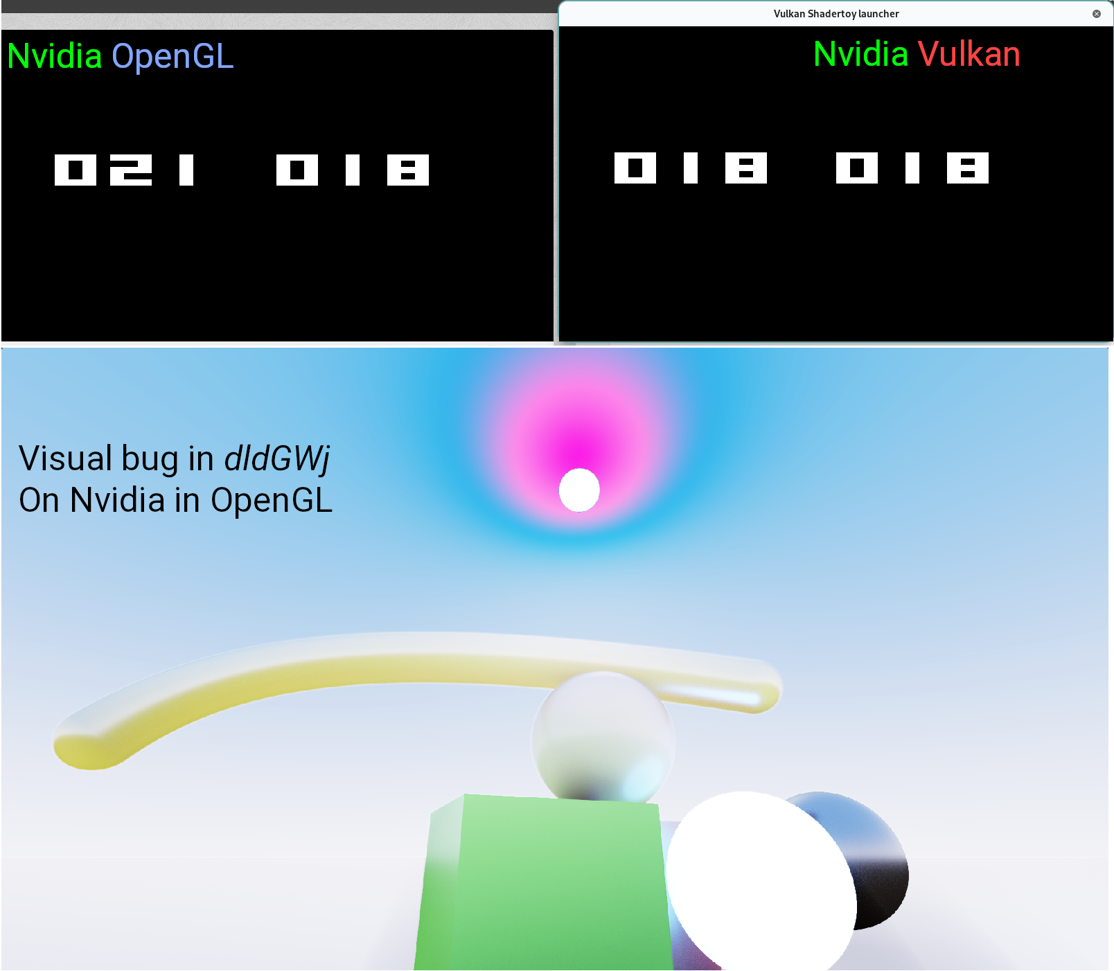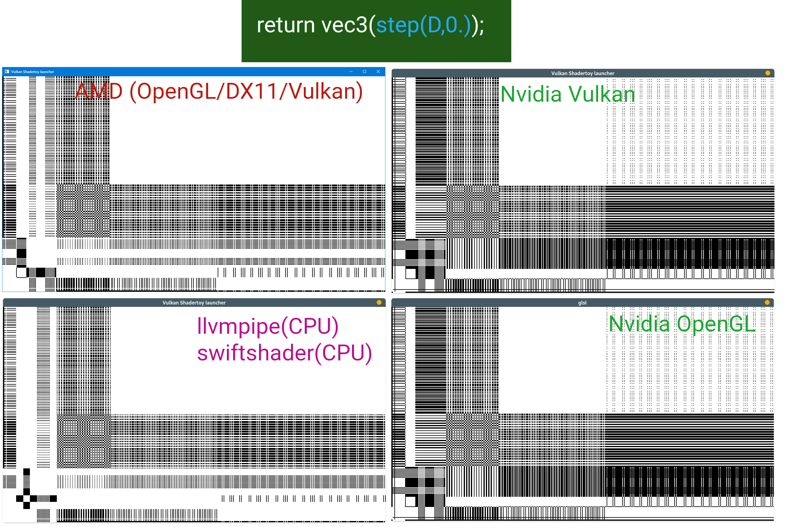 TEST - About fract-hash consistensy. Comparison for BUG TEST Rough Seas fract hash, discussion Hash without Sine. Look this two gif - OpenGL AMD (red) and Nvidia (green) and Vulklan AMD when iTime calculated on GPU as non-const and when it is const. On screenshot left - Vulkan Nvidia there appears lines I think because of sincos implementation on Nvidia. To test - #define iTime (8998.3+floor((900./37.)*1000.+float(min(iFrame,0)))/1000.) to Rough Seas shader code, to test iTime as const - remove +float(min(iFrame,0)) . |