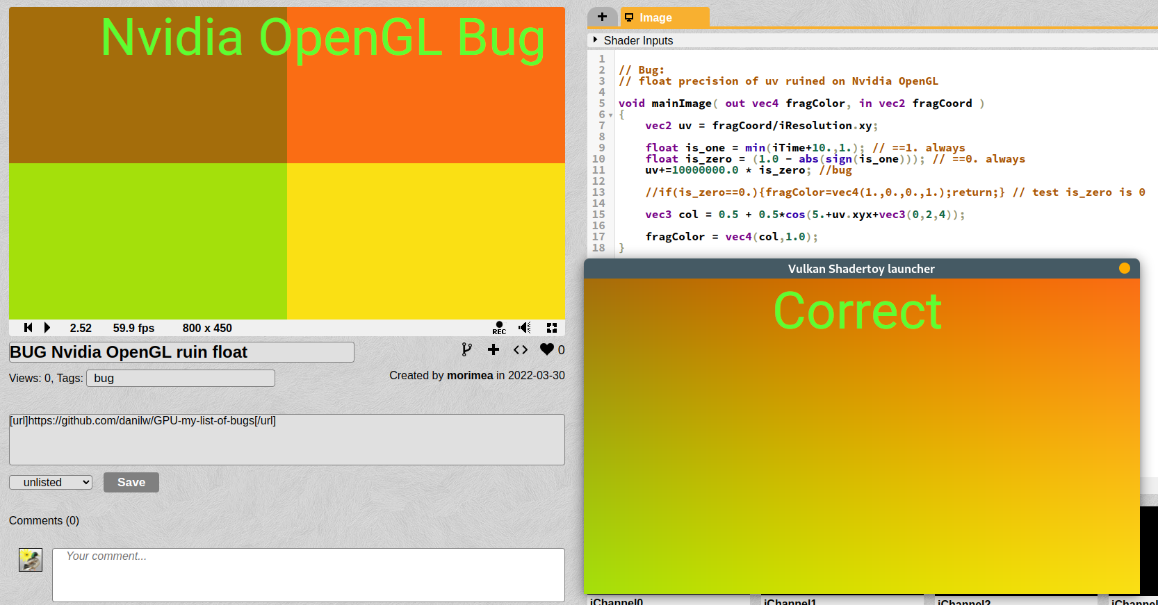 BUG Nvidia float as argument bug - (OpenGL and Vulkan) Nvidia OpenGL GLSL compiler somehow generates wrong floats when const floats used as argument of function, look code. (look like this is not bug, its compiler inconsistency, read shader code comments) (the "bug" is - floor((900./37.)*1000.)/1000. is 24.323999 on CPU and 24.324001 on GPU) |