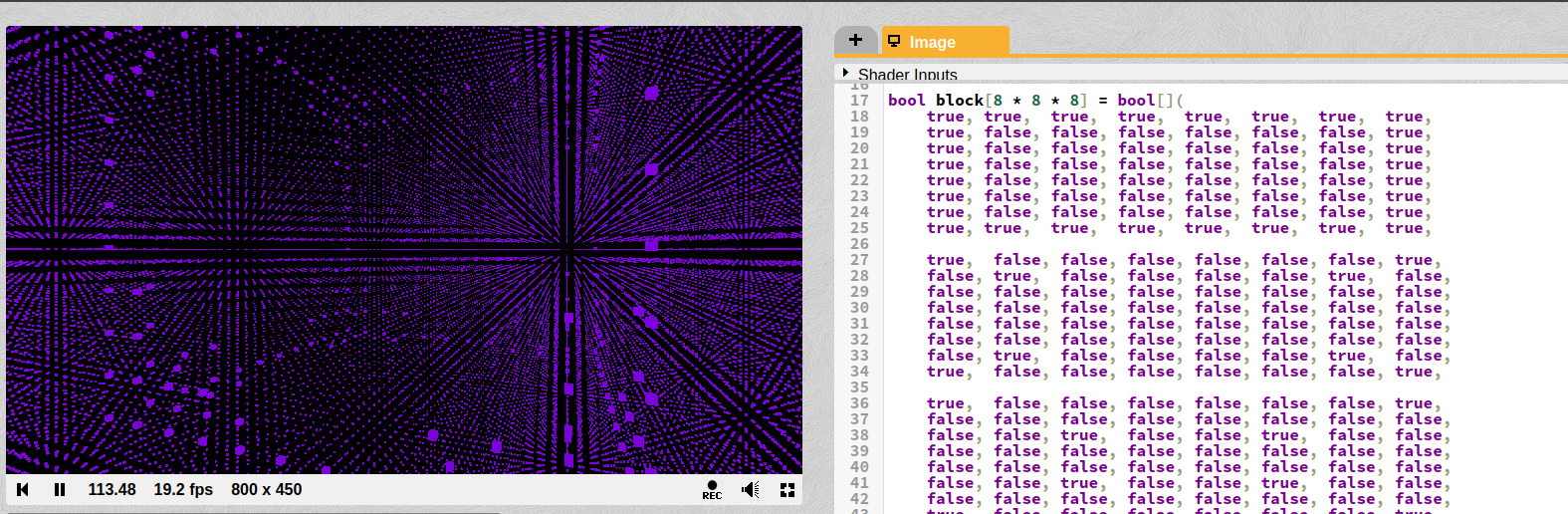 BUG 32-bit float pattern 2 - behavior related to losing float precision on small and large numbers, read comment and look two screenshots on shadertoy page. When screen has square size then determinant and inverse return some small and large numbers that leads to precision loss and this pattern on screenshot. | |
