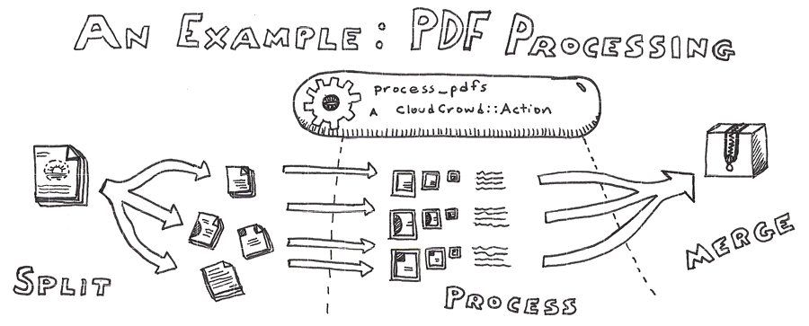 After writing a CloudCrowd::Action and installing it into the actions folder, CloudCrowd will be ready to run your own custom jobs. A minimal action consists of a single method, process, which defines the parallel part of the computation.