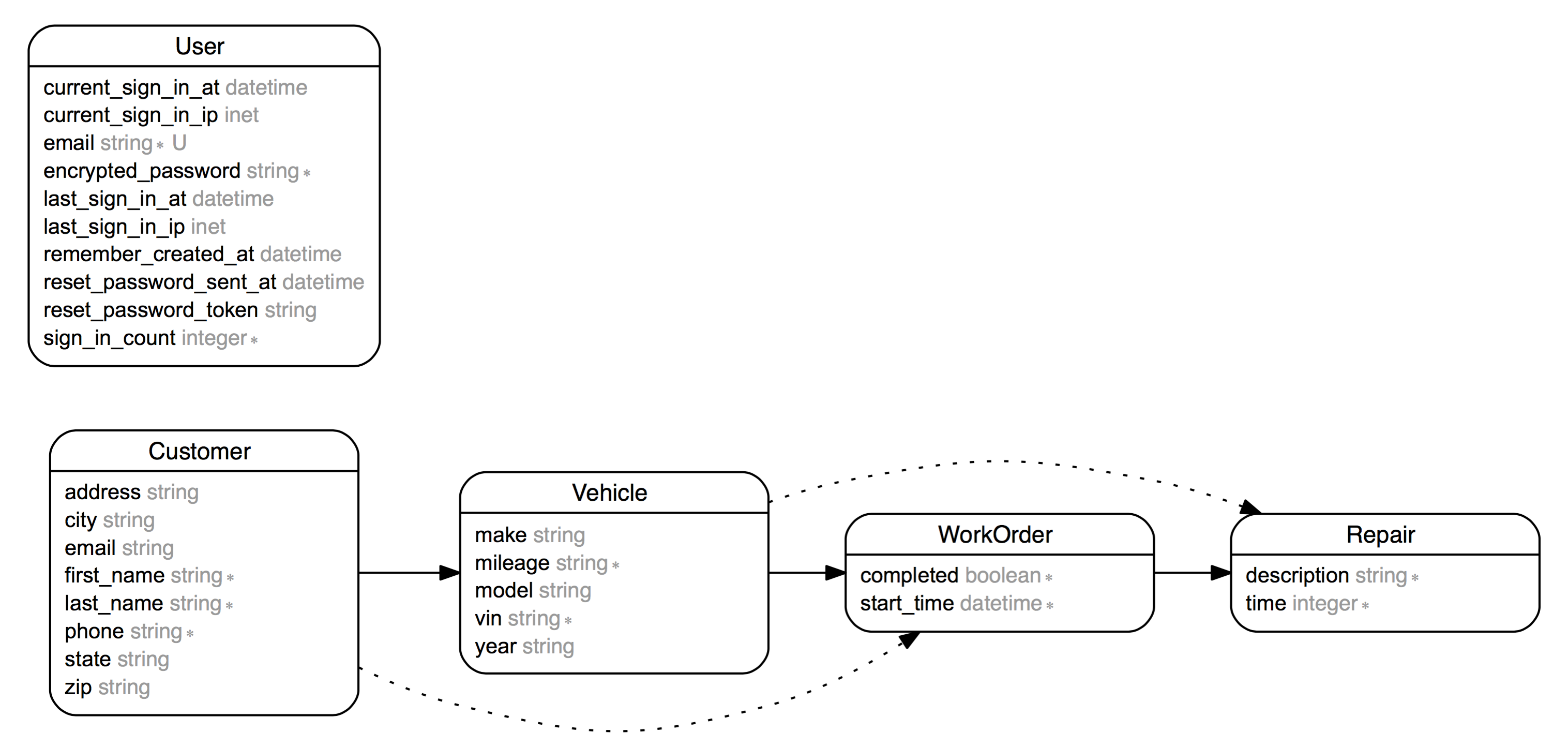 Vehicle: Vehicles in the system represent the physical vehicles that you are repairing. Information about the VIN and mileage are stored along with model year and manufacturer. Repair history can be queried through the relationship with work orders and repairs