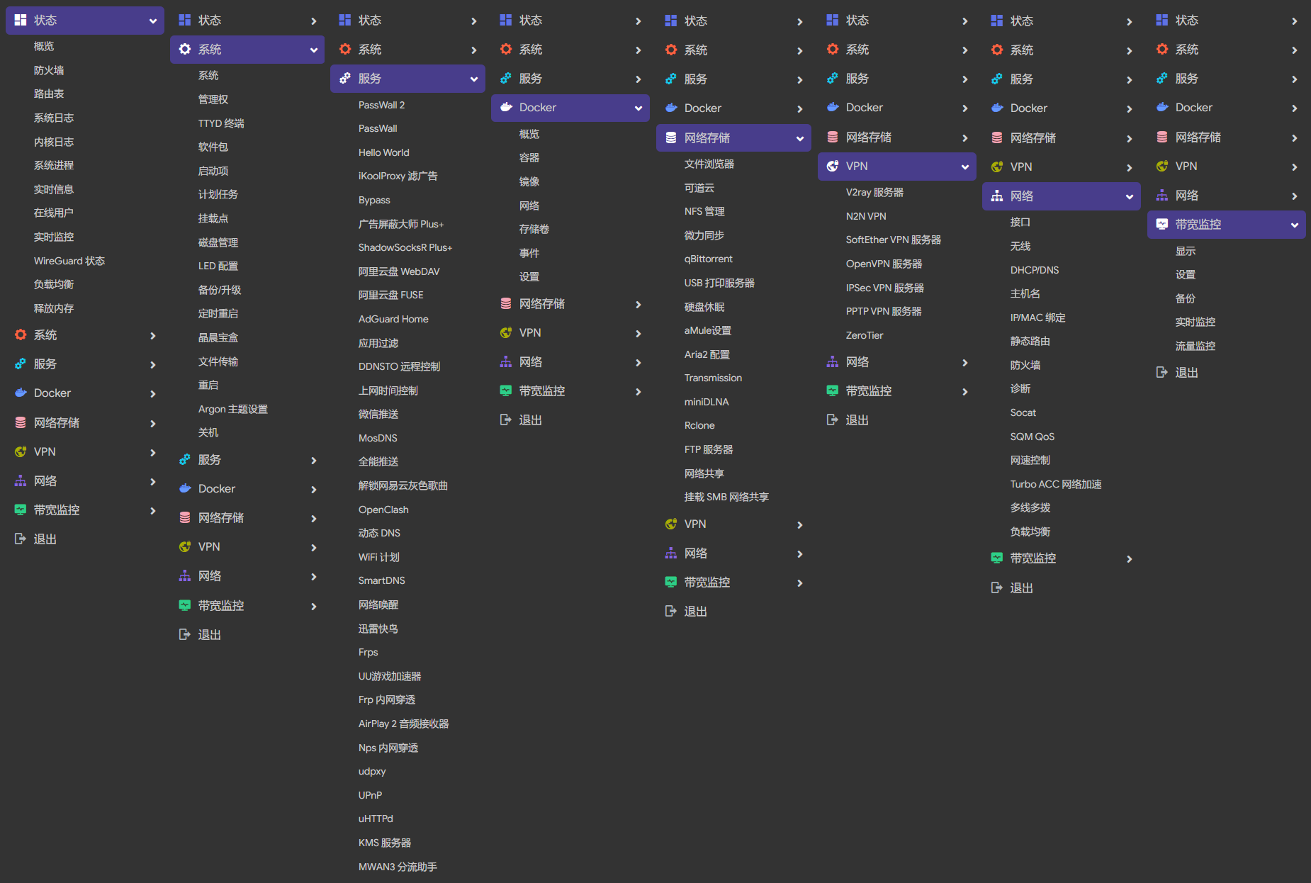 - 集成 Docker 服务,可在 OpenWrt 内自由部署 Docker 应用