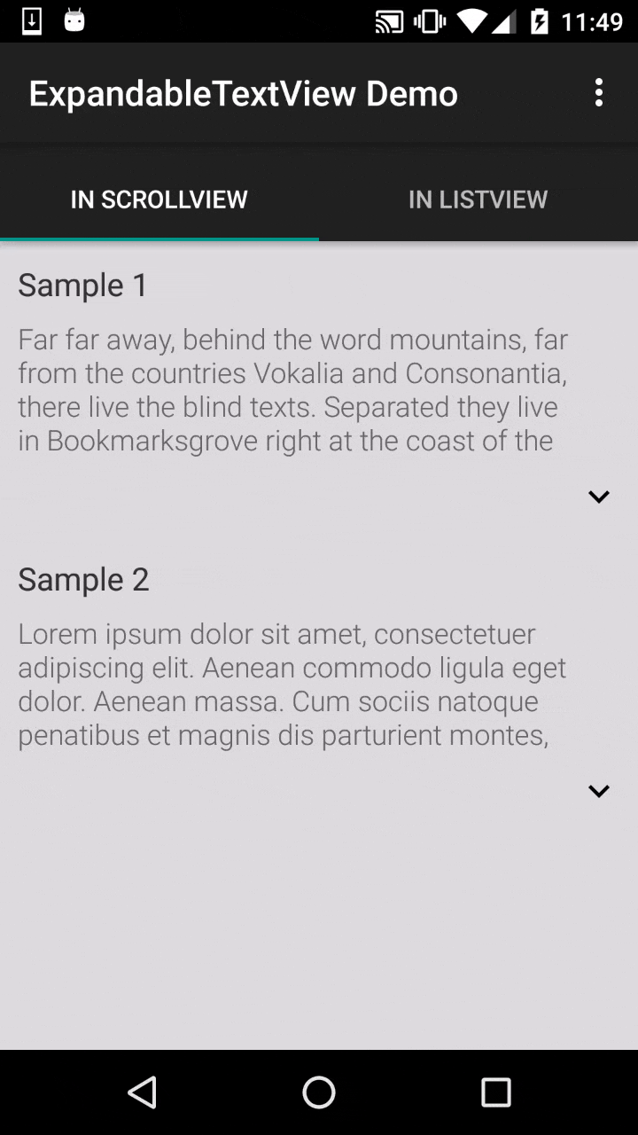The important thing to note is that the view Ids for TextView and ImageButton must be set to "@id/expandable_text" and "@id/expand_collapse" respectively for this library to work.