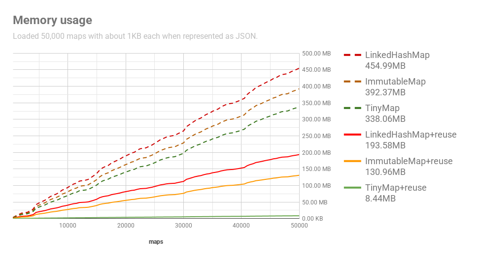 Below you can compare the memory requirements of loading 50,000 events as Gson's LinkedTreeMap, converting them to LinkedHashMap, guava's ImmutableMap, and TinyMap, both with and without objects reuse.