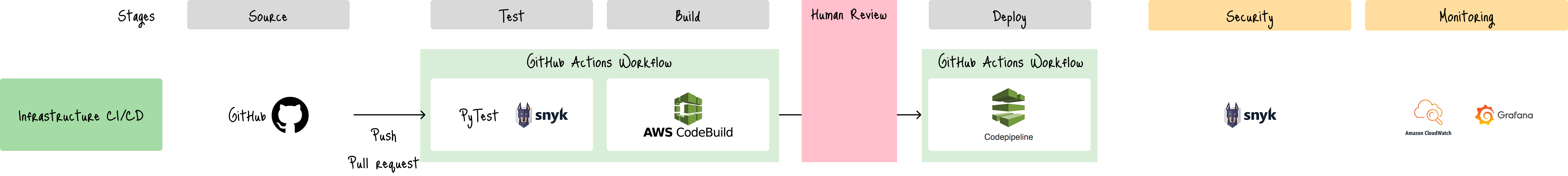 Deployment: A human review phase is mandatory between the build and deployment. After approval, another GitHub Actions workflow is manually triggered to deploy the updated Lambda function to staging or production.