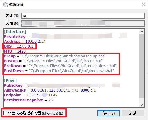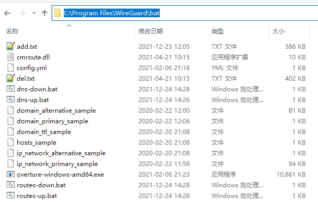 routes-up.bat和routes-down.bat为Wireguard在连接前和断开后调用的写入/删除路由表的批处理文件。通过Wireguard的Pre/Post命令调用。