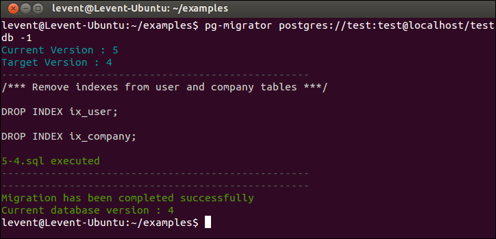 $ pg-migrator postgres://test:test@localhost/testdb +1