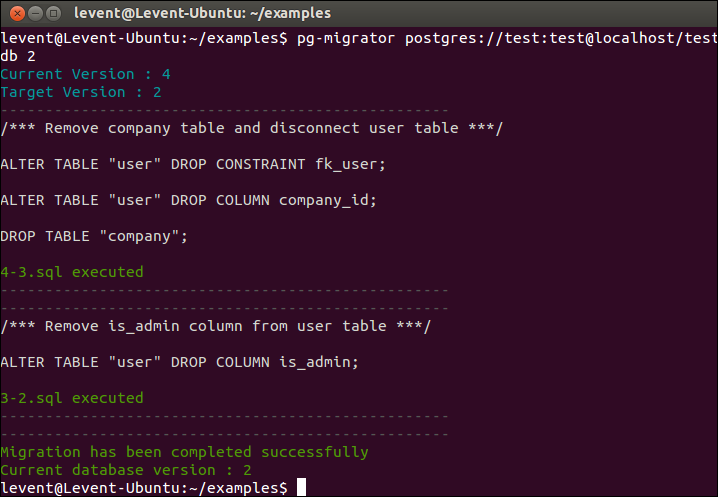$ pg-migrator postgres://test:test@localhost/testdb 2