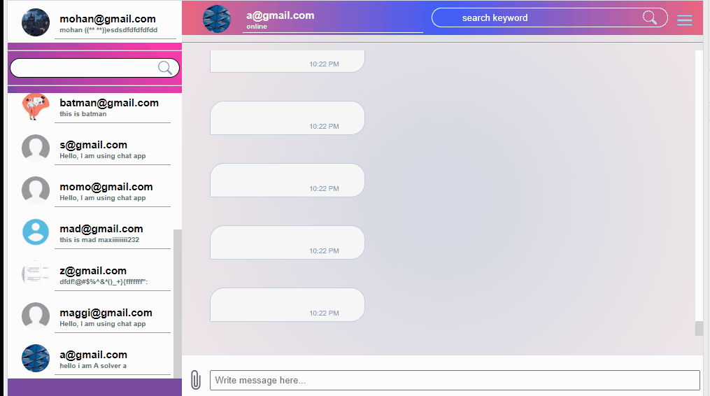 It is a Chat App build using Html, Css, Javascript for frontend and Node, Express as backend with MongoDb as database.It user socket.io library for real time communication .This chat app has following features.