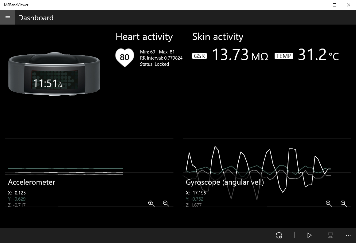 MSBandViewer is a Universal Windows Platform application used for tracking the sensors of a Microsoft Band such as the Heart Rate sensor, RR Interval Sensor, Skin Temperature, etc. so you can then create and export a single file for analyzing the session data.
