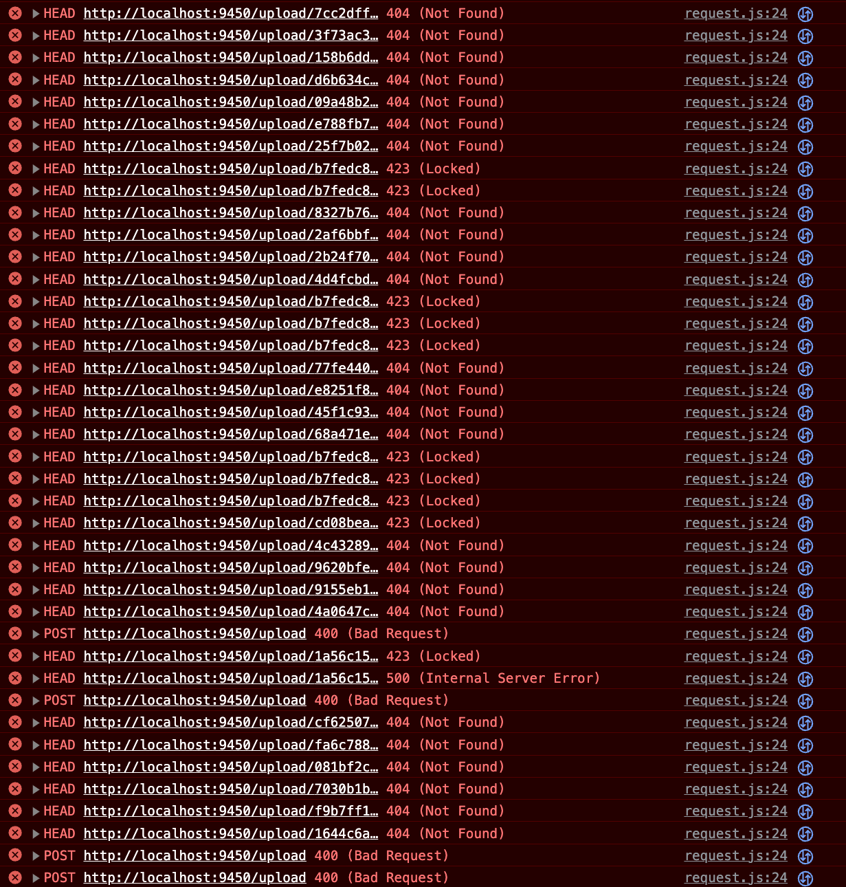 as I'm using my own UI and don't need anything else 😄. When I use the first option. I see 404 on the HEAD request. If I have the parallel greater than 1, I can see many more 404 instances. When I increase parallel from 1 to another number. The process does not finish. Nor do I get 1 file. I see a bunch of chunked files. Intermittently I see a range of errors and if I try another upload. Sometimes if I look at the TUS console: