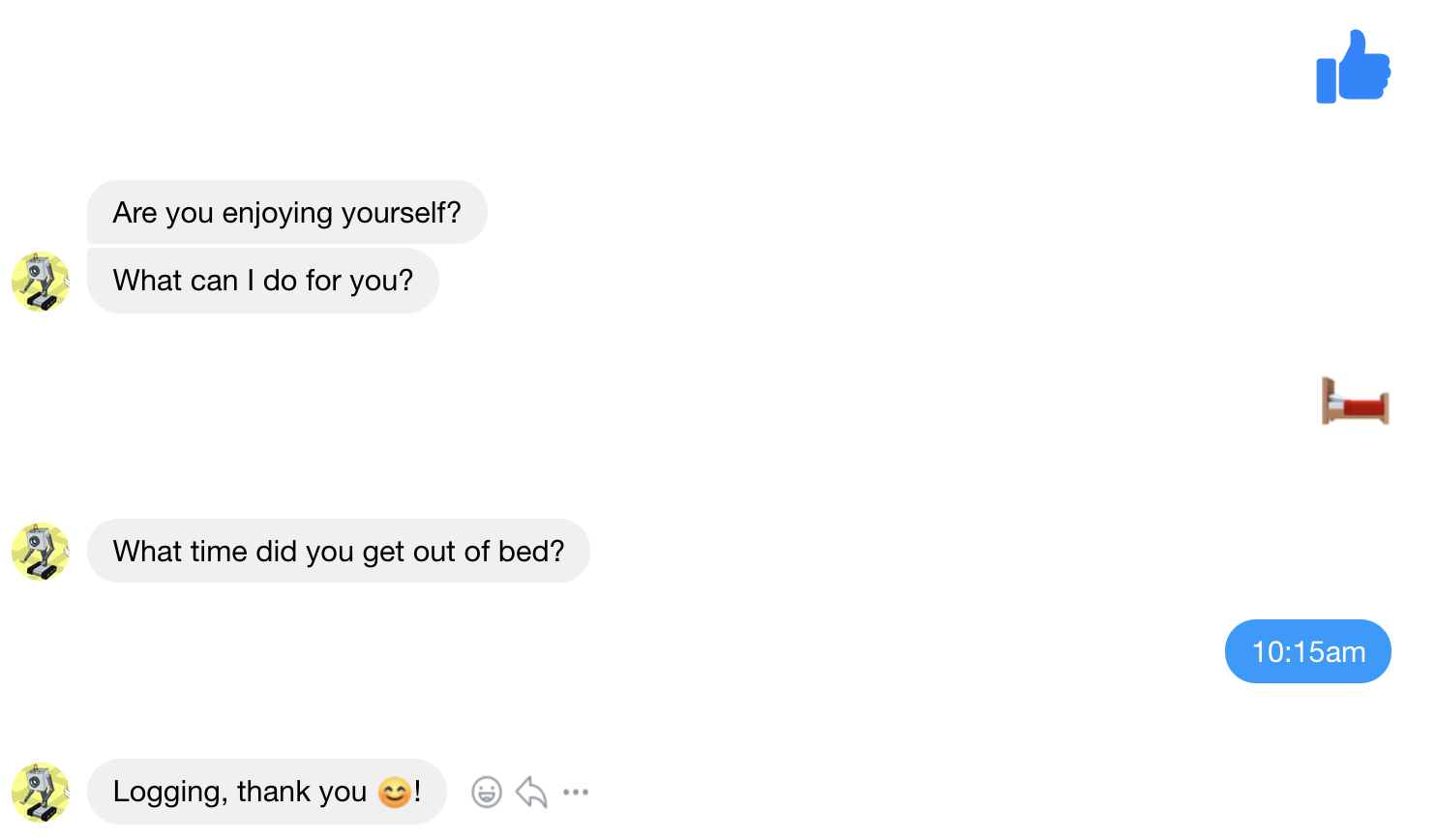 Also includes code for scheduling tasks that I do every day (such as creating a jorunal). I hooked this API to a chatbot (using https://chatfuel.com/ free version), so that I can quickly log metrics on the go. Here are some screenshots of the chatbot in action.