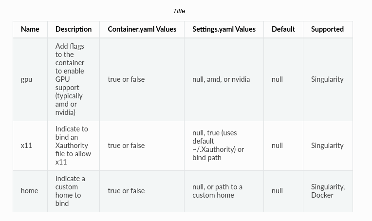 - Support for container features. E.g., if a container.yaml has features->gpu, the container technology knows how to process that to add appropriate flags.