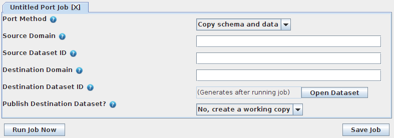 Port jobs are used for moving data around that is already on the Socrata platform. Users that have publisher rights can make copies of datasets through this tool. Port jobs allow the copying of both dataset schemas (metadata and columns) and data (rows).