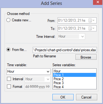 - From file - Load data from a specified file. The program connect to the file via Excel COM Object. First row must contains column names. Date column must have Date or Double format. You should select Time variable and, if necessary, specify Time interval and Date format for it. Also you should select one or multiple Series variables.
