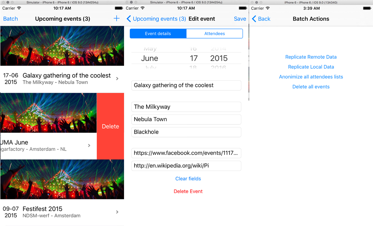 This app demonstrates Core Data and persistent storage, by reading Event data from both, locally and remotely retrieved JSON file / response, creates and stores those Events in a SQLite datastore. It is possible to do single and batch updates, deletions, retrieving and filtering on stored Events.
