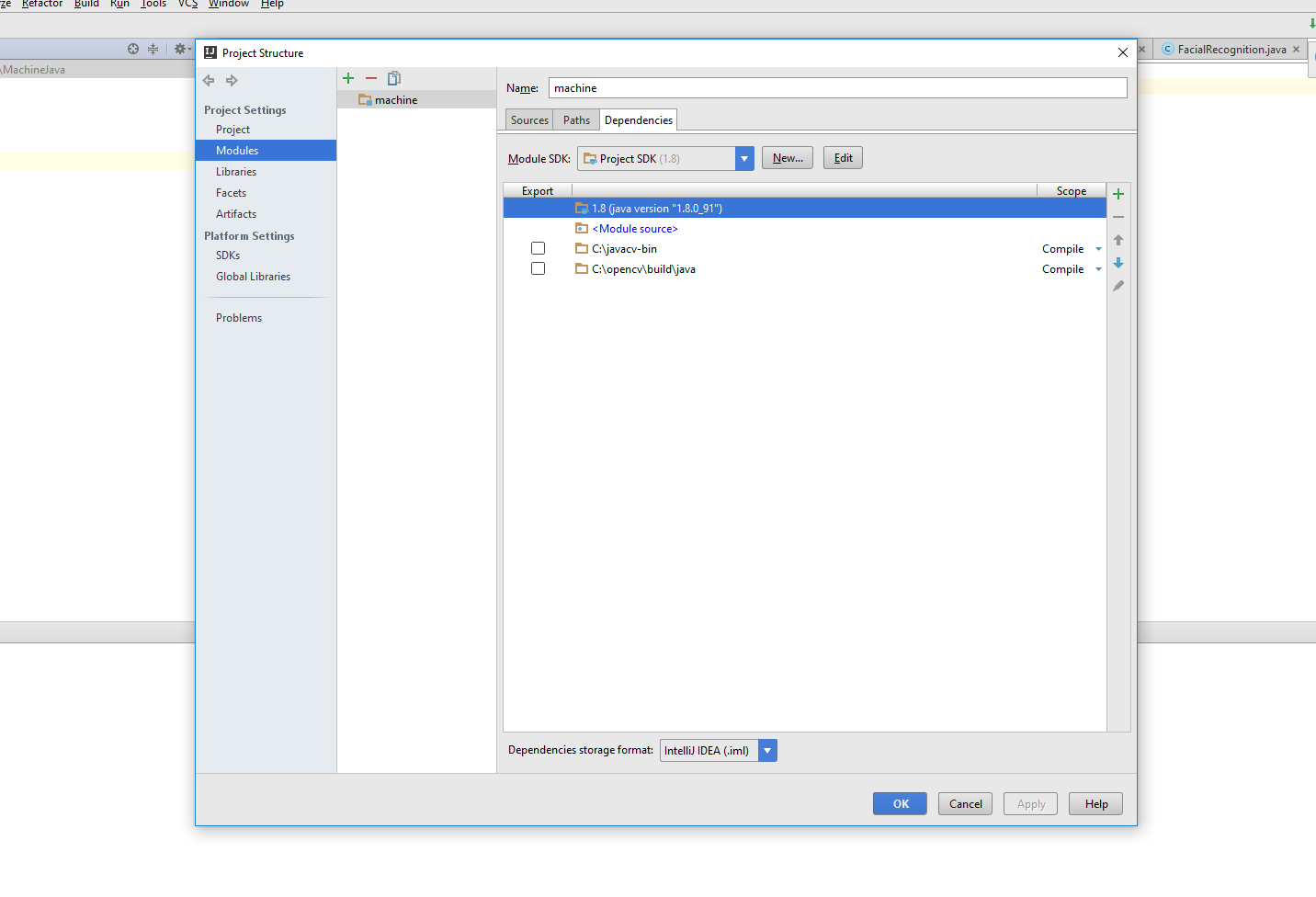 - Open File -> Project Structure and select Modules on left and click Dependencies. With using green plus button on right of the screen add OpenCV and JavaCV dependencies.