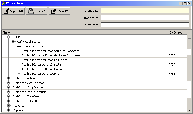 This small tool loads the chosen BPL (compiled by Delphi) and lists all exported classes. For each class it then shows: