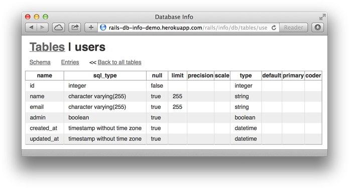 Adds an html endpoint to your Rails application which will give you a quick display of your database schema and contents for reference at http://localhost:3000/rails/info/db